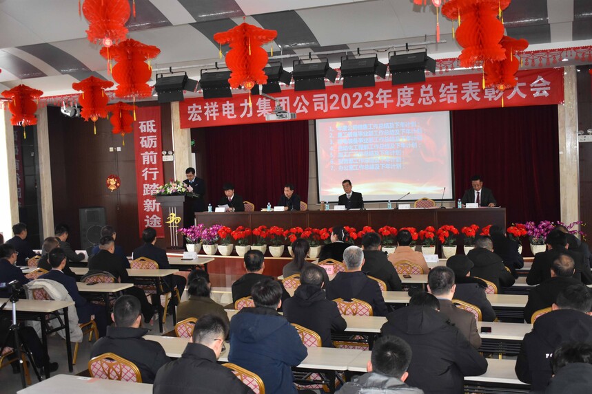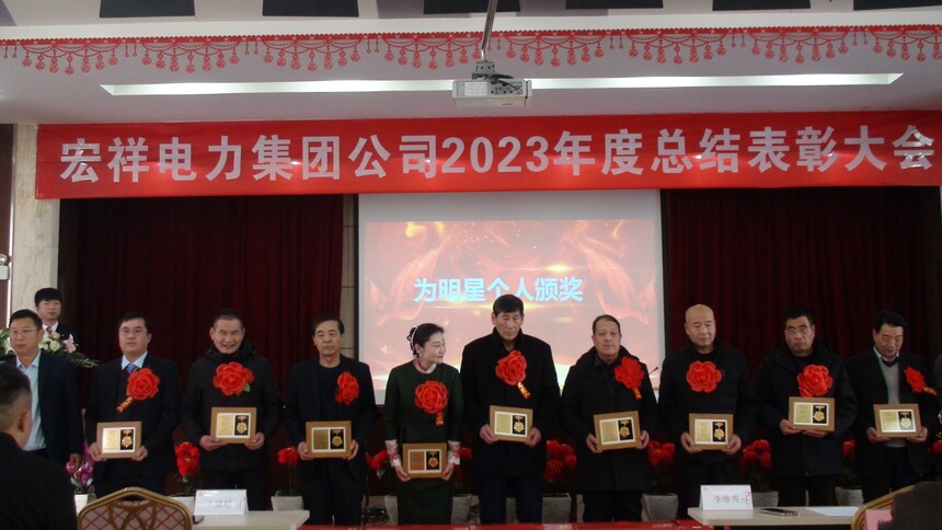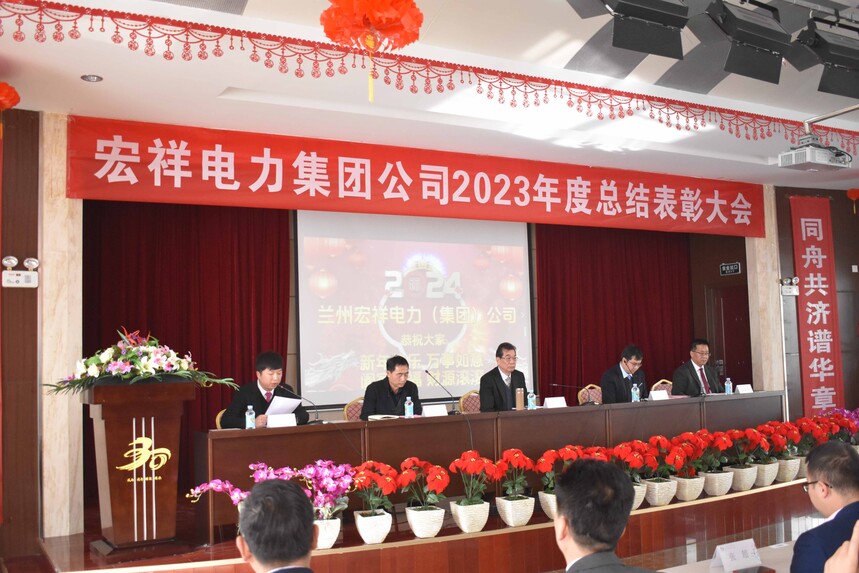 蘭州宏祥電力(集團)公司2023年度總結表彰大會2024年2月4日下午,蘭州宏祥電力(集團)公司2023年度表彰總結大會在集團五樓禮堂隆重舉行,百余名與會代表在莊嚴的國歌聲中開始了大會議程。主席臺就坐人員:王歆,王勇,姚東平,梁瑞旺,李政霖(主持會議)。首先,王勇宣讀了集團領導班子成員和部分中層干部的任命文件。隨后,各部門負責人分別做了部門工作總結發言。在莊嚴喜慶中,公司領導為2023年度集團公司先進集體和個人頒發了榮譽證書、獎品和獎金。各獲獎單位及個人發表了熱情洋溢的感言。集團董事長、總經理王歆做了2023年度集團公司工作報告暨成立三十年回顧講話。會議結束后,代表們在集團辦公大樓前合影留念。